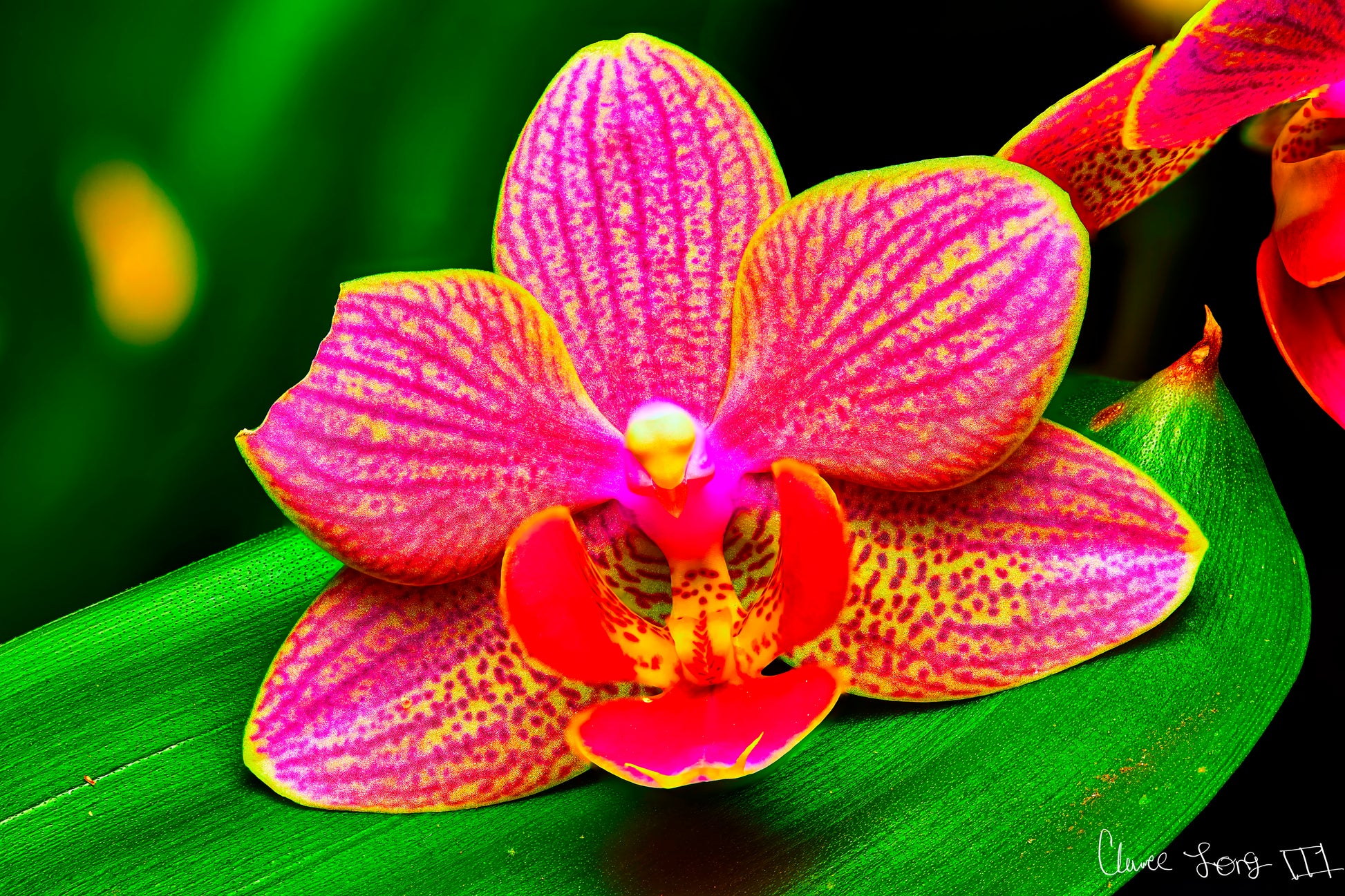 In this macro fine art photograph, Vigorous Orchid radiates life with boldness and brilliance. Its petals blaze with a striking fusion of hot pink and radiant yellow, creating intricate patterns that pulse with energy. Each line and spot etched into the orchid’s surface adds depth and rhythm, giving the flower a texture that feels both velvety and electric.